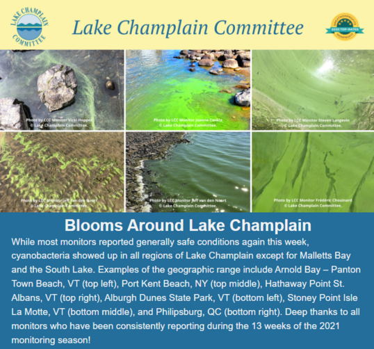 Although generally safe conditions still dominate on the cyanobacteria datatracker, blooms showed up in several sections of Lake Champlain and Lake Memphremagog this week.