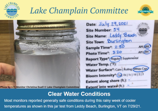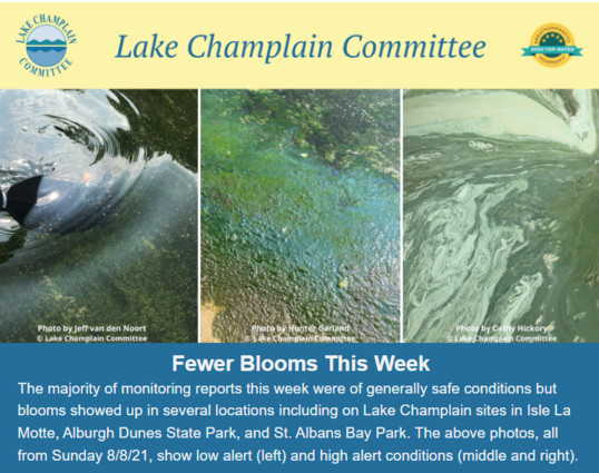 We had many clear water reports early in the week but conditions changed in some areas as the temperatures rose and the air stilled later in the week. A bloom took off in St. Albans Bay, and alert conditions were witnessed elsewhere on Lake Champlain, Lake Carmi, and Lake Memphremagog. Nutrients, temperature, and still conditions will all help blooms develop, flourish, and persist. The high temperatures predicted for much of next week could cause blooms to take off. So, it’s a great time to attend the 8/12/21 9 AM to noon virtual Lake Champlain Committee (LCC) Training session via Zoom to learn how to recognize, avoid, and report cyanobacteria. Sign up here if you’d like to attend for educational purposes and use this online form if you’d like to join our 2021 cyanobacteria monitoring team.
