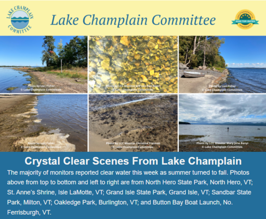 Clear water dominated on the cyanobacteria tracker during this first full week of fall and the 15th week of the cyanobacteria monitoring program. Most monitors who are still able to report recorded safe conditions, great for late-season recreation. Cyanobacteria was reported at one site each in Lake Champlain’s Main Lake Central and Main Lake South sections and several times during the week at Lake Carmi.