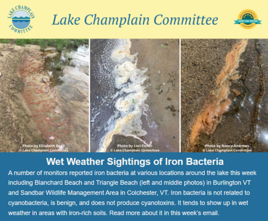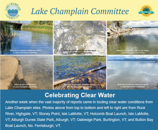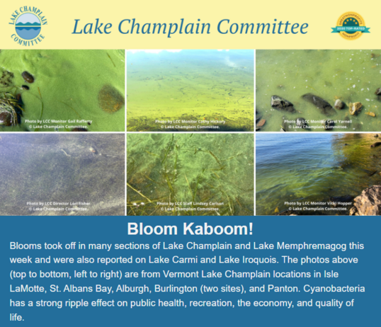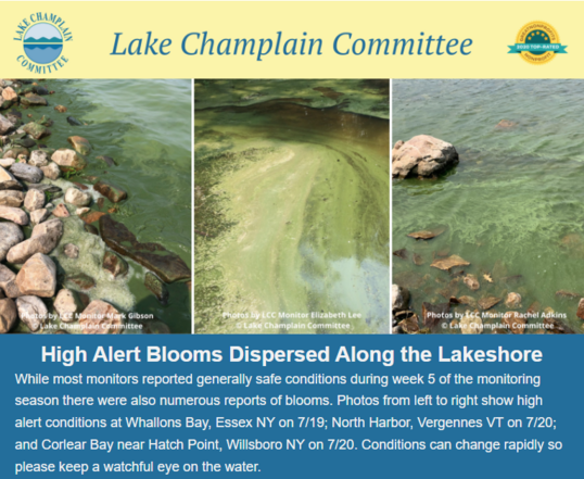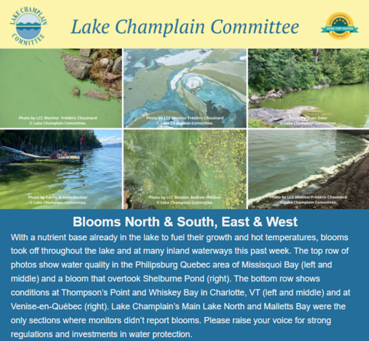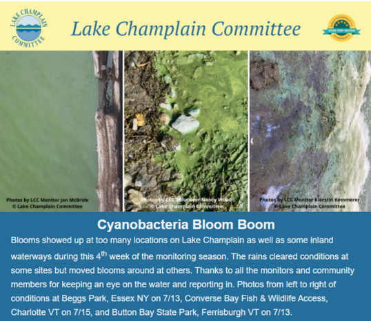 Lake Champlain Committee (LCC) and community monitors filed a total of 246 reports this week as blooms showed up in a host of Lake Champlain shoreline and inland lake locations. Escalating temperatures spurred cyanobacteria growth that closed beaches at several lakeshore communities. Keep a close watch on the water as well as shoreline areas whenever you’re recreating. In this low water year, we are seeing ponding on some of our beaches which are also prone to blooms as depicted in photos found here.