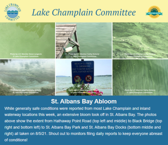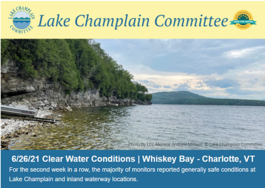 Happily water conditions improved significantly this week! Roughly 85% of the Lake Champlain reports and 94% of inland waterway reports showed generally safe conditions. Cyanobacteria sitings were restricted to Lake Champlain’s St. Albans Bay, Inland Sea, and Main Lake Central, along with Lake Carmi and Muckross Pond. The Week 6 compilation of results includes reports through 2:00 PM on Friday, July 30.