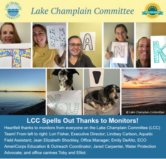 In sun and rain, heat and cold, monitors collectively filed over 2,700 reports during the 2021 season. In the links and photographs below you’ll find our last weekly report compilation for 2021; see a late season bloom at Arnold’s Bay; learn what a difference a day can make; view water samples of cyanobacteria and clear water conditions; witness beach beauty, autumn glow at Isle LaMotte, late season lake beauty, and a Lake Memphremagog sunset; and catch the LCC Team raising a glass as we close out the 2021 monitoring season.