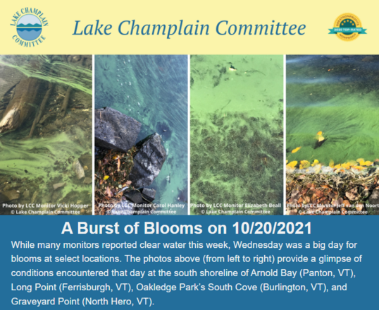 Cyanobacteria Monitors filed over 240 reports this past week as blooms popped up or persisted in numerous locations on Lake Champlain and several inland waterbodies. Lake Champlain’s Inland Sea, Main Lake Central, Main Lake South, Missisquoi Bay, South Lake, and St. Albans Bay all experienced blooms as did Chittenden Reservoir, Lake Carmi, Lake Iroquois, Lake Memphremagog, and Shelburne Pond.