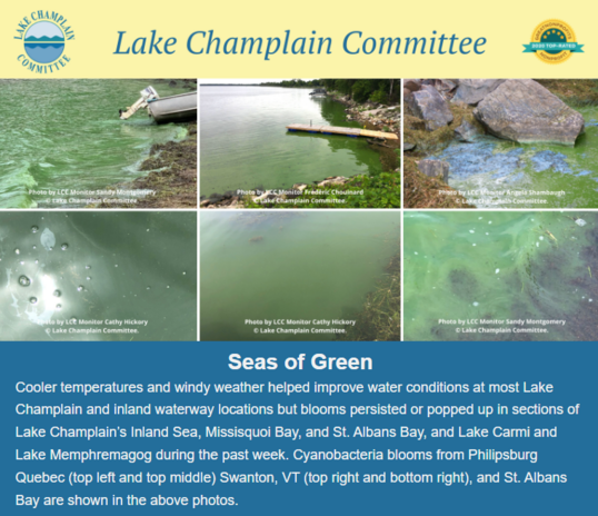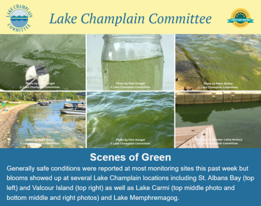 Generally safe conditions prevailed at most locations again this week but cyanobacteria was reported at Lake Champlain’s Main Lake Central, Main Lake South, Missisquoi Bay, St. Albans Bay, and South Lake and at Lake Carmi and Lake Memphremagog.