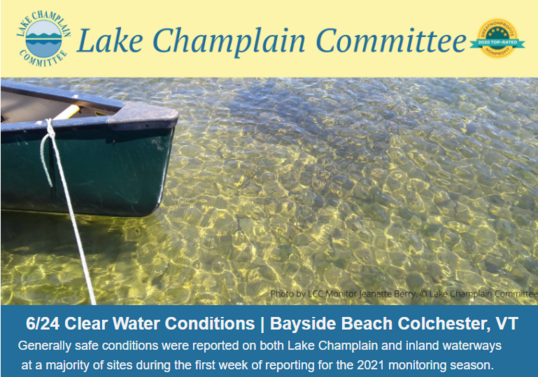Thank you for signing up to receive the Lake Champlain Committee (LCC)Cyanobacteria monitoring reports! Monitoring began this week and will run through early fall. Each week we’ll send you an update about conditions monitors are finding around Lake Champlain and several inland lakes. This week’s report covers conditions from Sunday, June 20 through early-afternoon on Friday June 25. While our first report of the season was of a cyanobacteria bloom in one section of Missisquoi Bay on June 20, the vast majority of reports we’ve received to date indicate generally safe conditions.