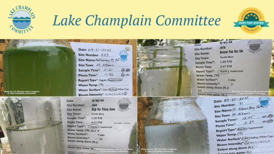 Our week 4 cyanobacteria monitoring report for July 10 through July 16 was delayed due to a breakdown with the cyanobacteria tracker. Monitors filed 187 reports during a busy week with blooms showing up in Lake Champlain’s Inland Sea, Main Lake North, Main Lake Central, and Main Lake South and at Lake Carmi and Lake Memphremagog while all other inland waterways reported good conditions. Please scroll through this email for Week 4 Monitoring Results for 7/10 – 7/16/22, and visuals of where cyanobacteria exist, bottled blooms, Lake Carmi cyanobacteria close-ups, and clear water at Valcour Island and Spring Lake.