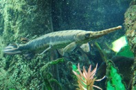 All gar belong to the family Lepisosteidae which is Greek for bony scales. Longnose gar are one of seven gar species. All have diamond-shaped scales connected with peg-and-socket joints. The scales are reinforced with dentin similar to the compound in our teeth. Gar skin was used by Native Americans as arrowheads, native Caribbeans as breastplate armor, and early American settlers as a hardened coat around their plows. In French gar are called Le poisson armé – the armored fish. Ancestral versions of gar have been found in the fossil record from the Permian Period 250 million years ago, making them among the oldest of fish families.