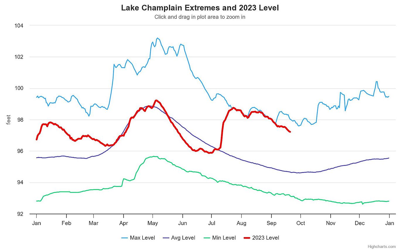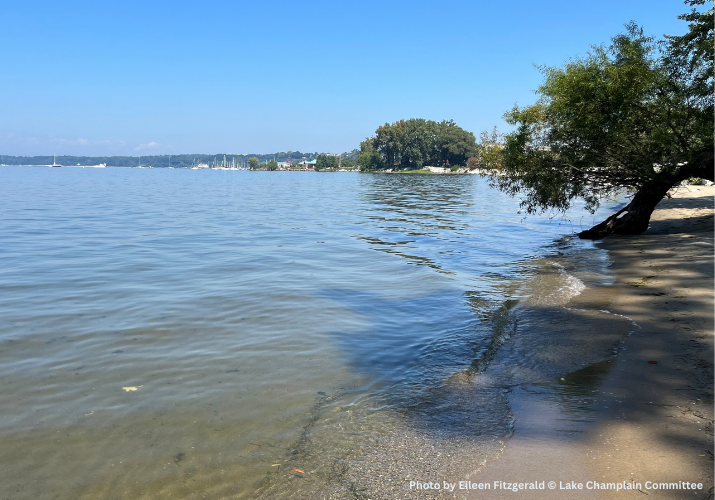 If you have been to a beach on Lake Champlain any time since the Summer 2023 floods, you’ve probably noticed less of what you went there for: the beach. Water levels are still unseasonably high and shoreline areas that are usually dry are inundated from the floods and the consistent subsequent rain we’ve received. The average lake level for September in a typical year is just below 95 ft, and in 2023 it was over 97 ft. A difference of just over two feet may not sound too consequential, but it can have a range of significant shoreline impacts.