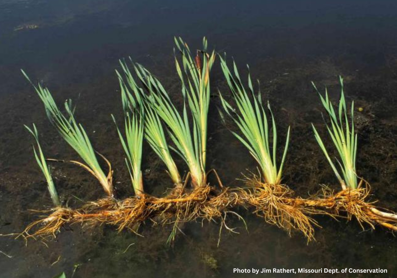 The lack of seed production from most aquatic plants means that the majority of these plants are perennial—they go dormant in the winter rather than releasing seeds and dying like an annual plant. Different plants employ different strategies to accomplish this. Plants such as eelgrass (Vallisnera americana) use their rhizomes, or underground horizontal stems that connect the shoots of individual plants. In winter, the rhizomes stay intact in the lakebed soil while the leaves of the plant die back, which is why beaches can often be awash with eelgrass fragments in late fall. Another plant that makes use of rhizomes to overwinter is the yellow pond lily (Nuphar varigata). The lily is easily recognizable by the floating pad-like leaves and iconic yellow flowers that peek above the water in summer, but most of the plant’s biomass is in its long underwater stems that attach to an extensive underground network of rhizomes in the lake bottom. As the leaves slow in photosynthesis as fall unfolds, carbohydrates are stored in the rhizomes and the leaves die back while the plant becomes dormant. In spring, those same carbs mobilize to produce leaves again. Broadleaf cattails (Typha latifolia) have rhizomes too—in the fall, the leaves and the stalks drop. The dead fragments create important habitat for a variety of invertebrates and small fish, while the rhizomes live underground.