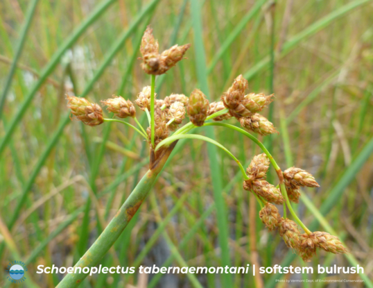 Soft-stemmed bulrush (Schoenoplectus tabernaemontani) has a wide native range--it‘s found nearly worldwide, including the Lake Champlain Basin. It is a rhizomatic, emergent, aquatic plant. Soft-stemmed bulrush typically forms a slowly-spreading clump of rush-like stems (culms) to 4-8 feet tall.