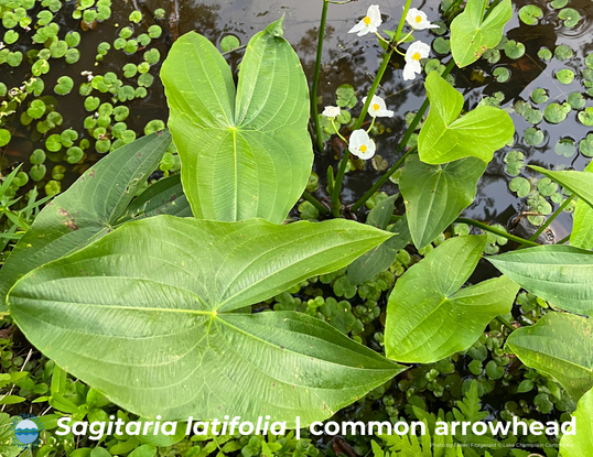 Common arrowhead (Sagitaria latifolia) is a colony-forming, aquatic perennial native to most of the contiguous US and southern Canada, including the Lake Champlain region. It rises above water level to a height of 3 feet. The long, emergent leaves are distinctly arrowhead shaped and they produce a white flower.