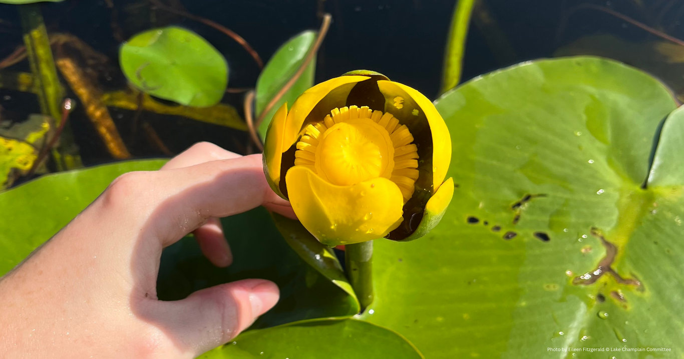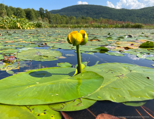 Yellow pond lily (Nuphar variegata) is a native aquatic plant with alternate, simple leaves, on submerged stems.is an aquatic plant with alternate, simple leaves, on submerged stems. It is one of the most iconic aquatic plants and is abundant in the Lake Champlain basin‘s waters.