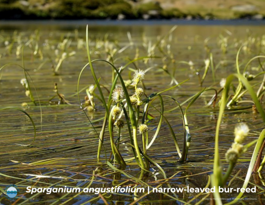 Narrow-leaved bur-reed (Sparganium angustifolium) is a perennial native aquatic plant producing a floating stem with long, narrow, flattened leaves which can be quite long, sometimes reaching over two mete producing a floating stem with long, narrow, flattened leaves which can be quite long, sometimes reaching over two meters. It can become abundant, practically covering the surface of the water.