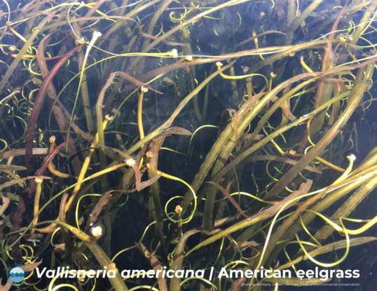 American eelgrass (Vallisneria americana) is a native aquatic plant with ribbon-like and dark-green leaves, and grows below the water surface. It is common throughout Lake Champlain and frequently washes ashore in clumps. It makes for a popular snack among wildlife.