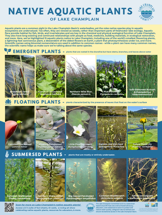 This poster highlights 15 aquatic plants native to Lake Champlain, including one of the world’s smallest flowering plants, a lightning-fast carnivorous plant, a descendent of the oldest flowers on Earth, a plant that photosynthesizes under ice, and many more. Each plant is is described with illustrative photos, identification tips, and notes on the relationship between the plant and people--as food, medicine, building materials, and ecological restoration. There are also notes on the ecological contributions each plant plays in aquatic systems, including biological aspects like its role on the trophic web as a food source, chemical aspects like nutrient uptake through roots, and ohysical aspects like stabilizing shoreline sediments.