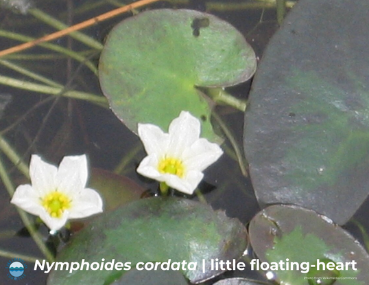 Little floating-heart (Nymphoides cordata) is native aquatic plant that resembles a miniture pond lily. It has small, floating, heart-shaped leaves with purple undersides.
