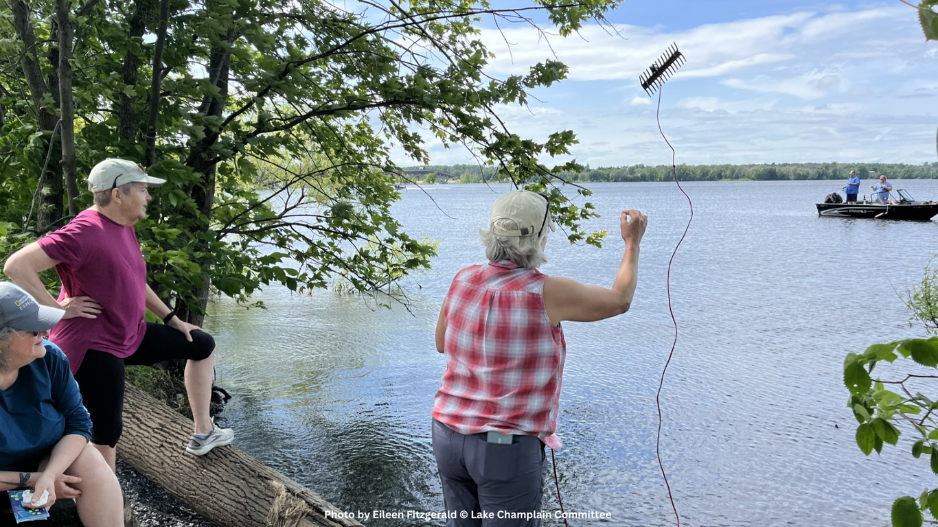 Volunteers then practiced their AIS rake throws, an Olympic event for the environmentally conscience lake-goer. A MacGyver’ed contraption consisting of two rake heads zip-tied together and attached to a 25-foot length of rope, the AIS rake enables volunteers to collect aquatic species from the lake and bring them to shore. Some rake tosses produced giant mats of muck and plants, while others yielded only a few tiny fragments of stems. Whatever the results, Eileen and the volunteers picked through the rake tosses and put the group’s AIS identification skills to the test. CHAMP volunteers will be surveying from July to September, checking their sites for AIS known to exist in Lake Champlain as well as species on our “watchlist” -- potential invaders that are not known to be in Lake Champlain, but are established in nearby waterbodies.